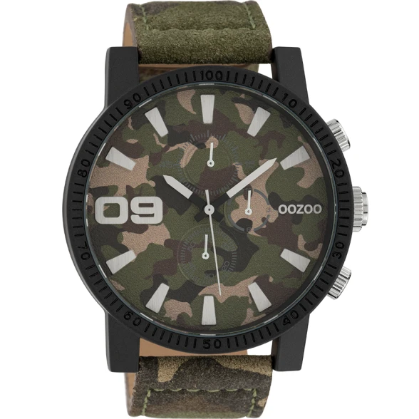 50mm black case. silver on army. army camo leather strap. designer timepiece imported from the Netherlands. quality quartz mechanism. nickel free stainless-steel back. splash resistant. 1-year mechanical warranty.