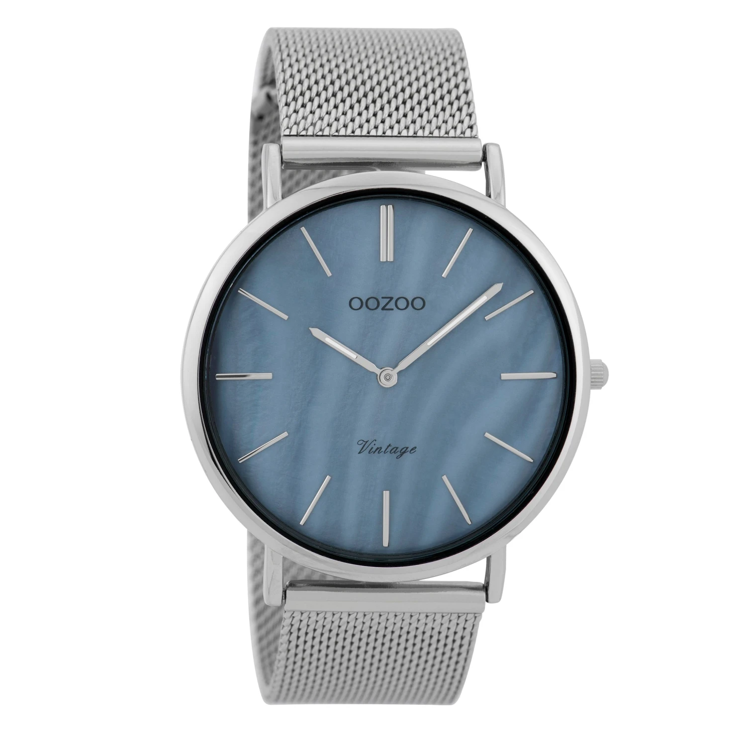 40mm vintage. silver case. silver on black pearl. silver mesh strap. designer timepiece imported from the netherlands. quality quartz mechanism. nickel free stainless steel back. splash resistant. 1 year mechanical warranty.