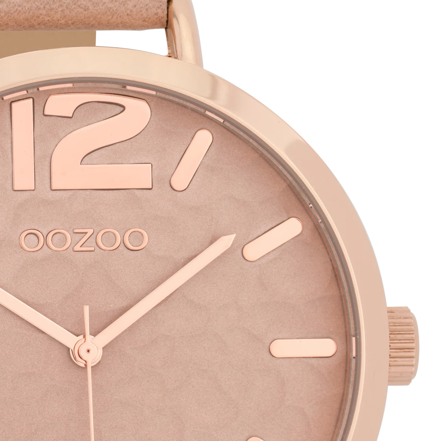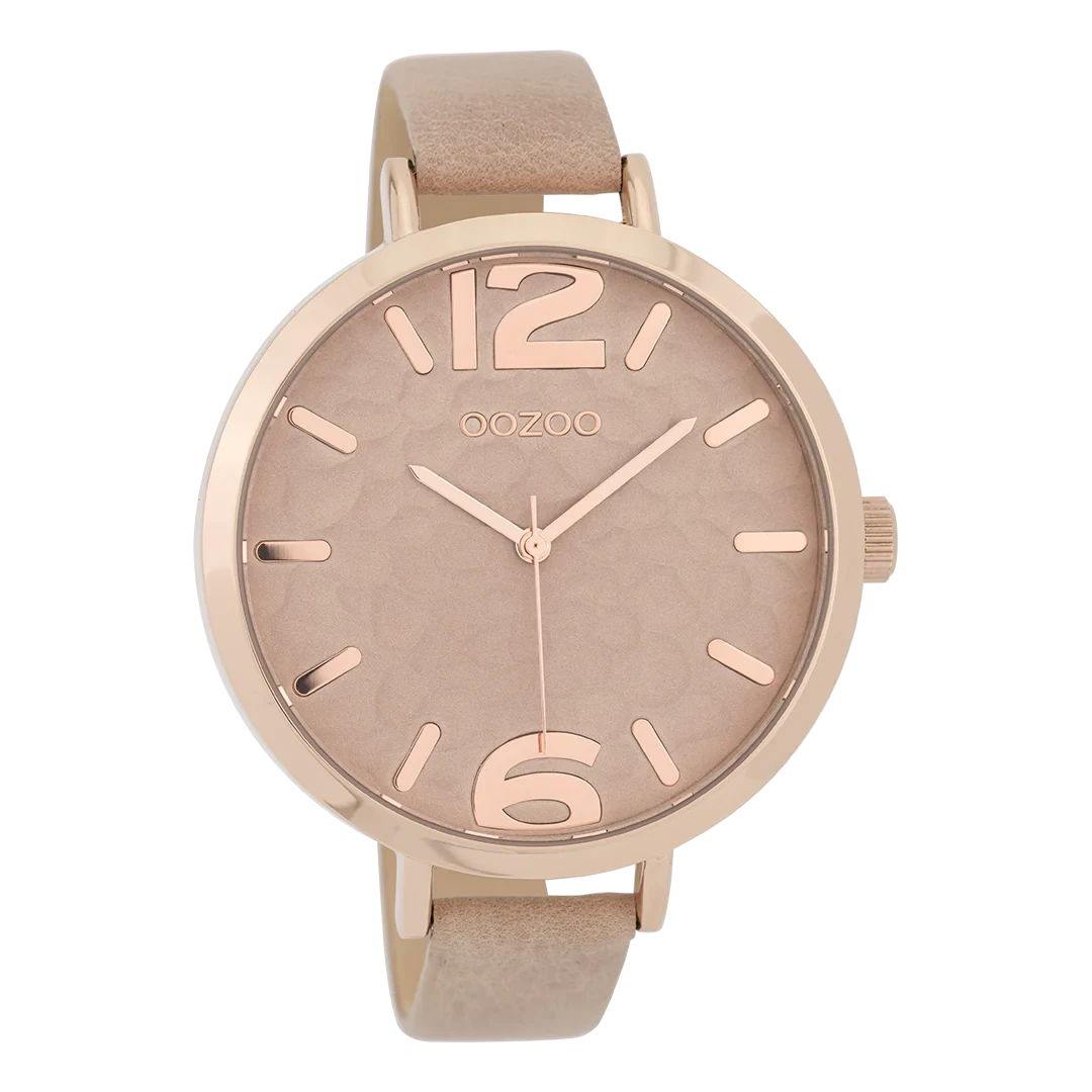 Stand out with this beautiful round ladies design from the trendy OOZOO Timepieces collection. The C9711 has a pink grey leather strap and 45 mm rose gold coloured metal watch case. You are making quite the fashion statement with this pink grey dial, rose gold coloured stripes and numbers digits and matching hands. This essential watch for your wardrobe has a mineral glass, stainless steel backplate and is nickel safe. This watch has a 2 Japanese movement and is covered by a 2 year warranty.ย