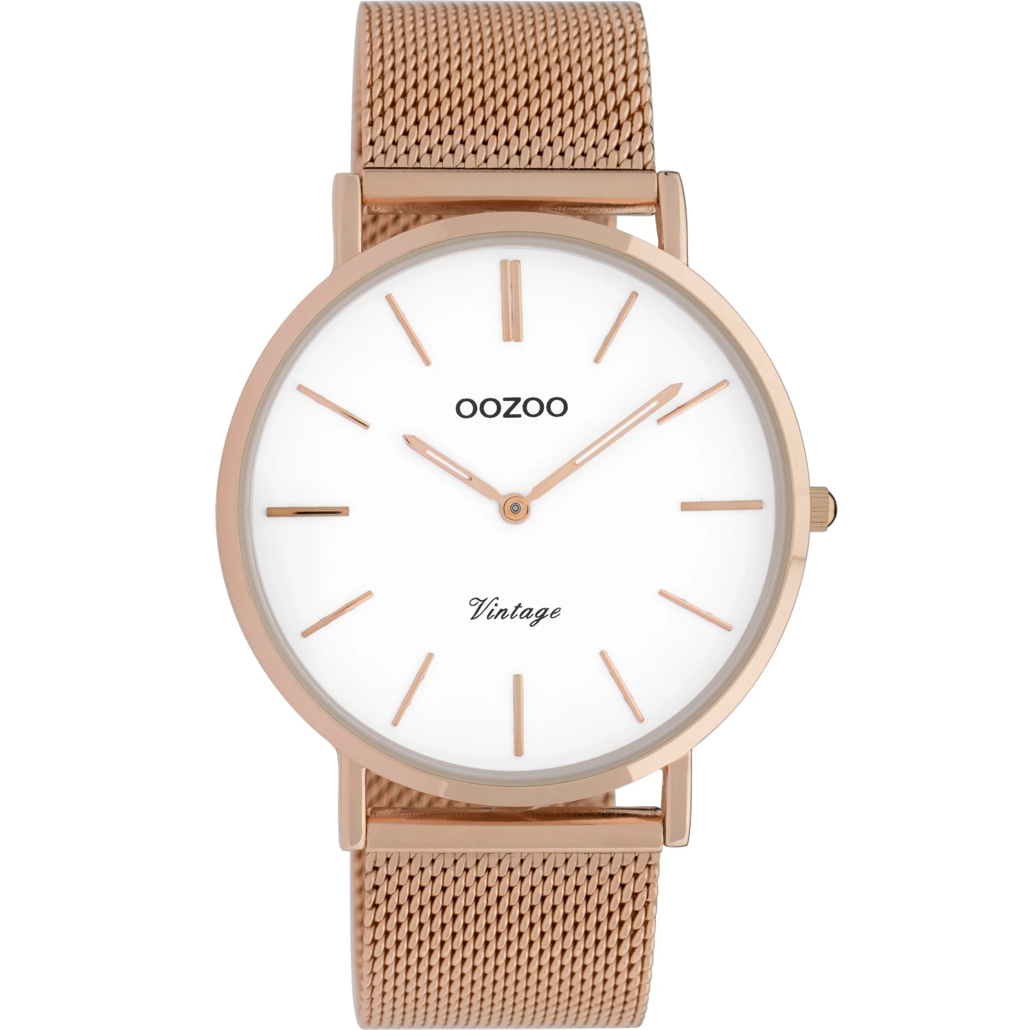 40mm vintage. rose gold case. rose gold on white. rose gold mesh strap. designer timepiece imported from the netherlands. quality quartz mechanism. nickel free stainless steel back. splash resistant. 1 year mechanical warranty.