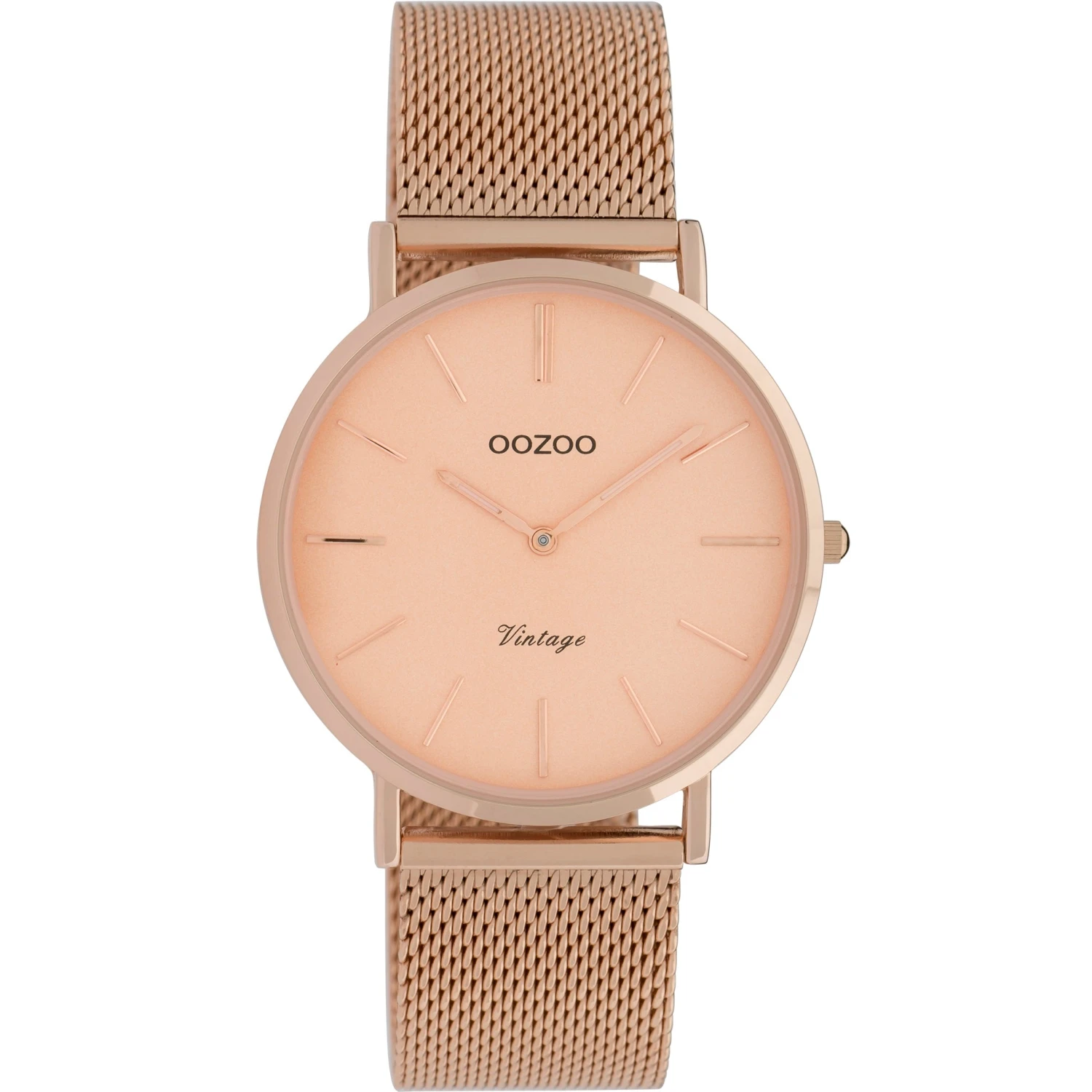 40mm vintage. rose gold case. rose gold on rose. rose gold mesh strap. designer timepiece imported from the netherlands. quality quartz mechanism. nickel free stainless steel back. splash resistant. 1 year mechanical warranty.