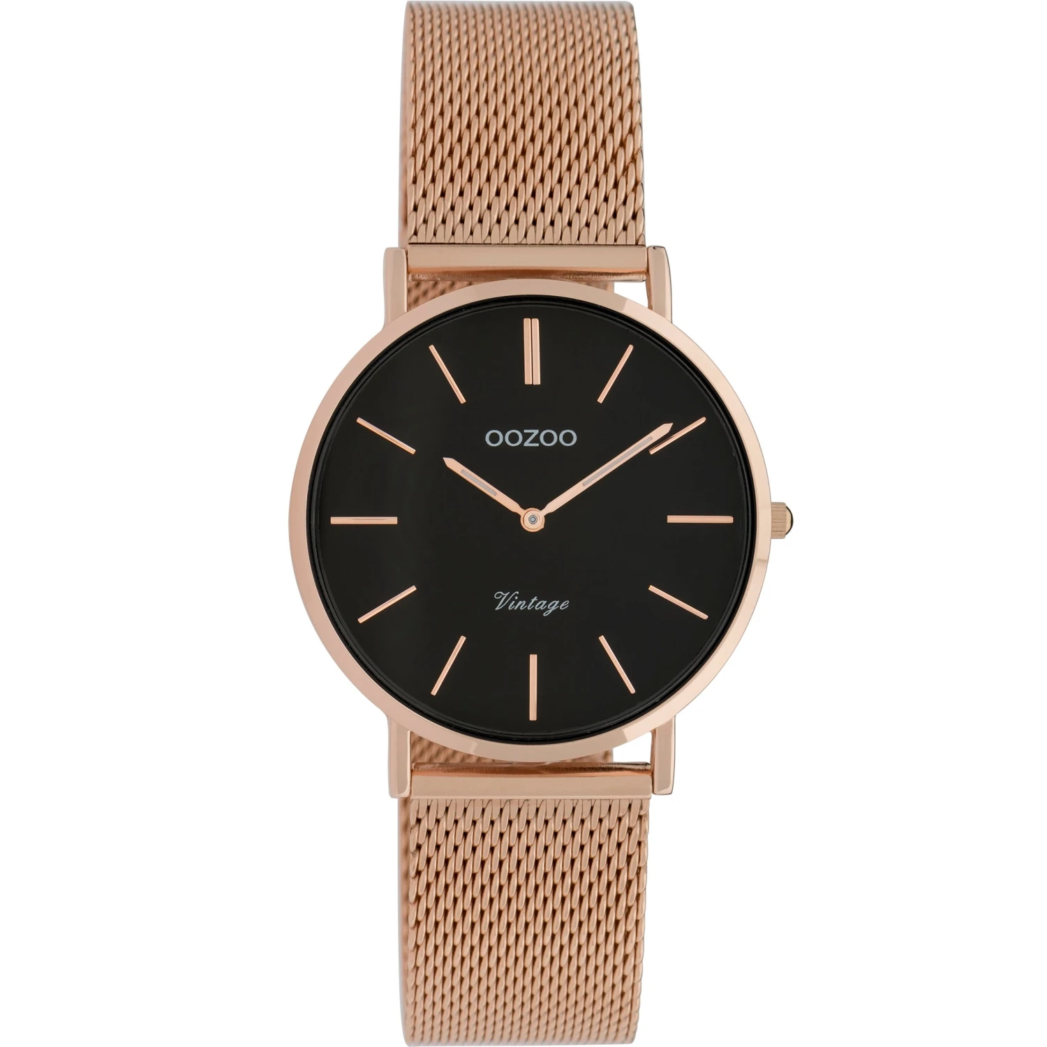 32mm vintage. rose gold case. rose gold on black. rose gold mesh strap. designer timepiece imported from the netherlands. quality quartz mechanism. nickel free stainless steel back. splash resistant. 1 year mechanical warranty.