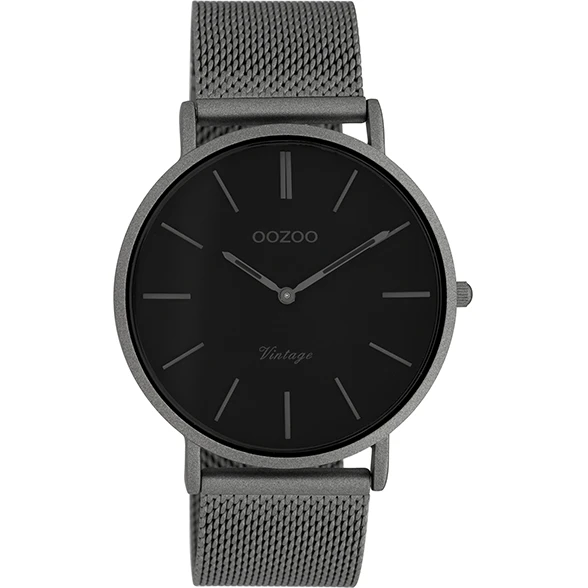 40mm vintage. titanium case. titanium on black. titanium mesh strap. designer timepiece imported from the netherlands. quality quartz mechanism. nickel free stainless steel back. splash resistant. 1 year mechanical warranty.