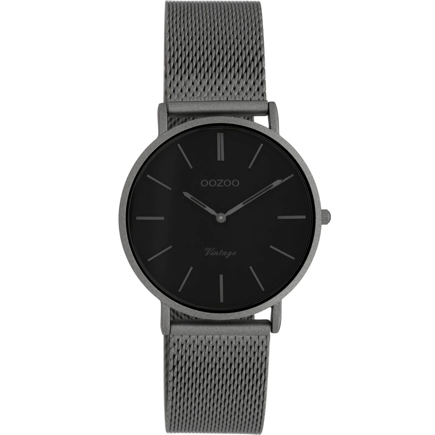 32mm vintage. titanium case. titanium on black. titanium mesh strap. designer timepiece imported from the netherlands. quality quartz mechanism. nickel free stainless steel back. splash resistant. 1 year mechanical warranty.