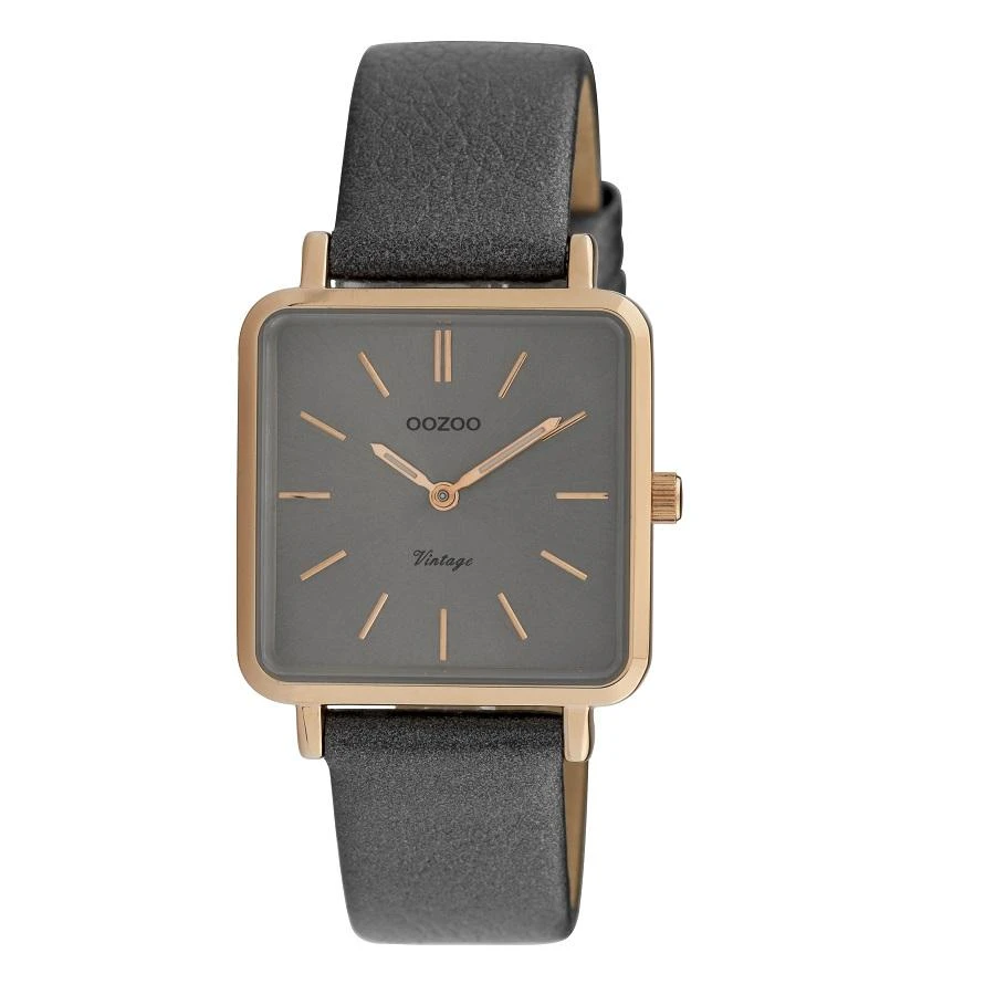 29x29mm vintage. rose gold case. rose gold on grey. metalised dark grey leather strap. designer timepiece imported from the netherlands. quality quartz mechanism. nickel free stainless steel back. splash resistant. 1 year mechanical warranty.