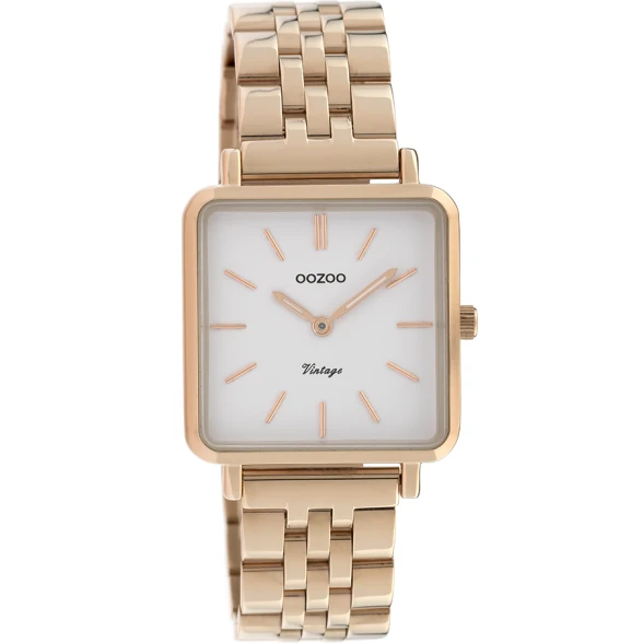 29x29mm vintage. rose gold case. rose gold on white. rose gold metal strap. designer timepiece imported from the netherlands. quality quartz mechanism. nickel free stainless steel back. splash resistant. 1 year mechanical warranty.