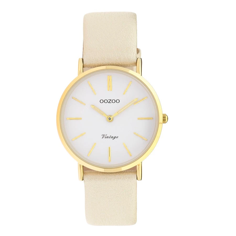 32mm vintage. gold case. gold on white. metalised gold leather strap. designer timepiece imported from the netherlands. quality quartz mechanism. nickel free stainless steel back. splash resistant. 1 year mechanical warranty.
