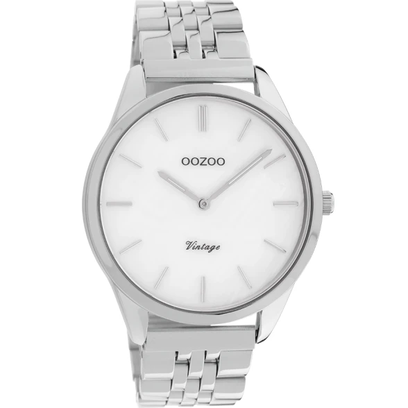40mm vintage. silver case. silver on pearlised white. silver metal strap. designer timepiece imported from the netherlands. quality quartz mechanism. nickel free stainless steel back. splash resistant. 1 year mechanical warranty.