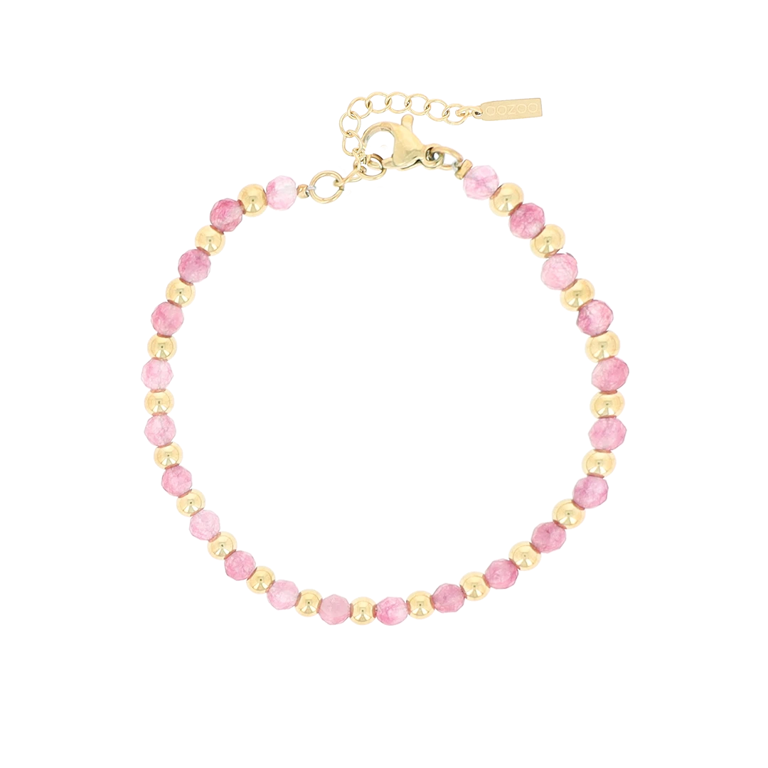 OOZOO Jewellery is a great addition to your personal accessories collection. This beautiful gold coloured bracelet with pink natural stones is the perfect ladies accessory to complete your outfit. The bracelet is 17 cm long and is 3 cm adjustable. This amazing piece is made of strong stainless steel with gold coloured plated PVD and therefore long-lasting. This material ensures you that your jewellery retains its beautiful color.ย
