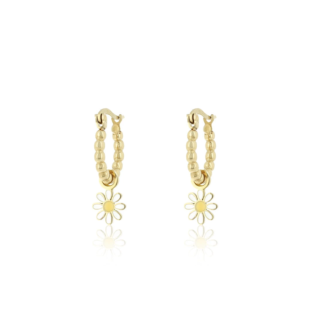 Introducing OOZOO Jewellery Earrings, the perfect accessories to add a touch of elegance and style to any outfit. These gold coloured hoop earrings are designed specifically for ladies who appreciate sophisticated and timeless jewellery. Crafted with high-quality stainless steel, these 24 mm earrings offer durability and long-lasting beauty. Each earring (16 mm) is adorned with a flower charm (8 mm), which adds a touch of whimsy and fun to the overall look.ย