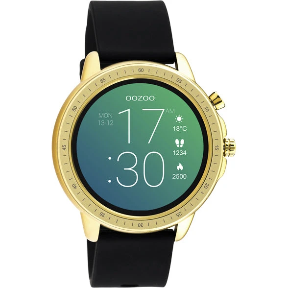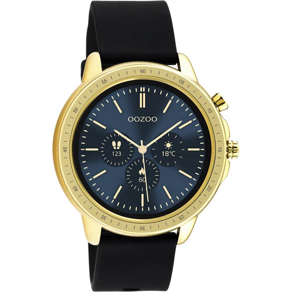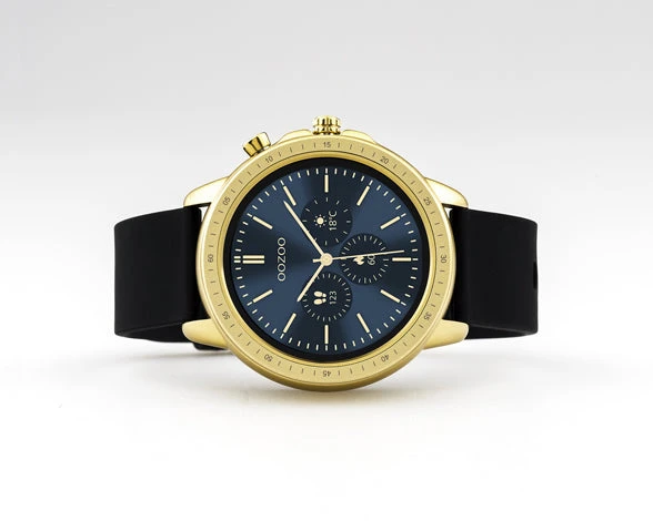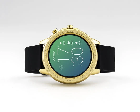 The Q301 with a round design from the OOZOO Smartwatches collection is unisex and the smart solution for everyone. This watch is a unique fashion statement with its strong black rubber strap with mat finish. This smartwatch has a ø45mm gold metal watch case. The smartwatch has different original OOZOO dials to choose. This watch is IP67 certified and nickel safe.