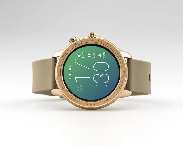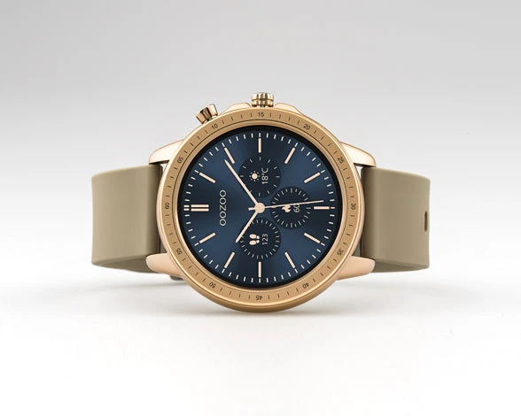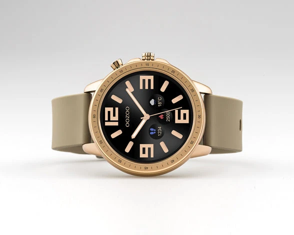 The Q302 with a round design from the OOZOO Smartwatches collection is unisex and the smart solution for everyone. This watch is a unique fashion statement with its strong taupe rubber strap with mat finish. This smartwatch has a ø45mm rose gold metal watch case. The smartwatch has different original OOZOO dials to choose. This watch is IP67 certified and nickel safe.