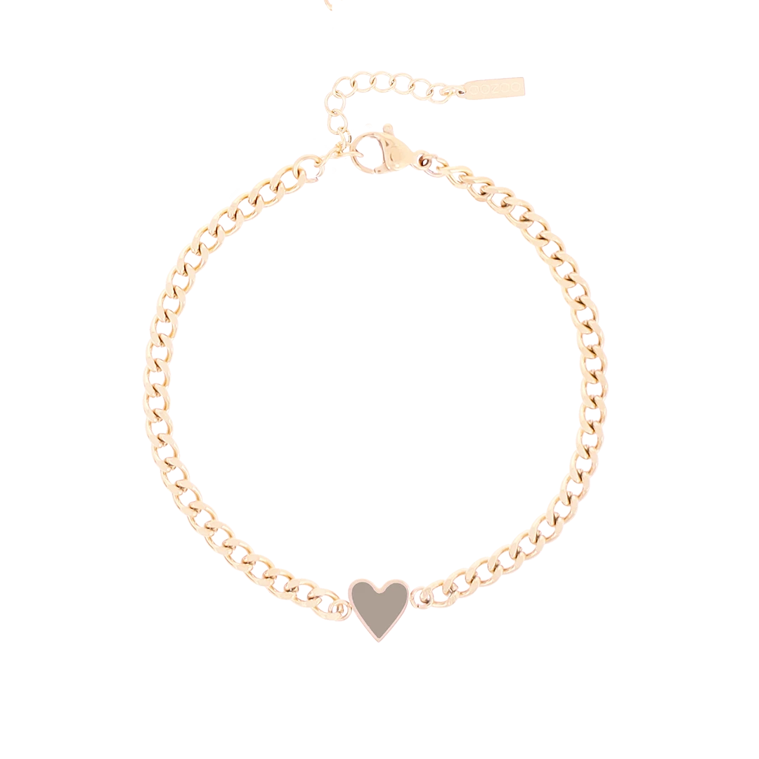 OOZOO Jewellery is a great addition to your personal accessories collection. This beautiful rose coloured bracelet with taupe heart charm is the perfect ladies accessory to complete your outfit. The bracelet is 17 cm long and is 3 cm adjustable. This amazing piece is made of strong stainless steel with rose coloured plated PVD and therefore long-lasting. This material ensures you that your jewellery retains its beautiful color.ย