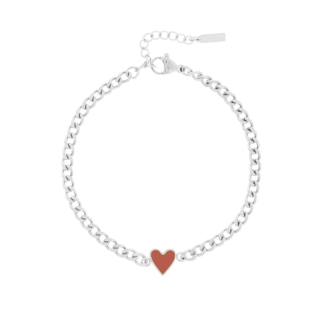 OOZOO Jewellery is a great addition to your personal accessories collection. This beautiful silver coloured bracelet with red heart charm is the perfect ladies accessory to complete your outfit. The bracelet is 17 cm long and is 3 cm adjustable. This amazing piece is made of strong stainless steel with silver coloured plated PVD and therefore long-lasting. This material ensures you that your jewellery retains its beautiful color.ย