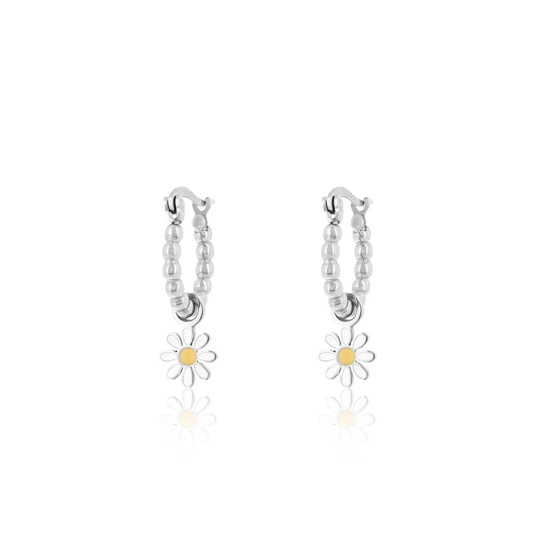 Introducing OOZOO Jewellery Earrings, the perfect accessories to add a touch of elegance and style to any outfit. These silver coloured hoop earrings are designed specifically for ladies who appreciate sophisticated and timeless jewellery. Crafted with high-quality stainless steel, these 24 mm earrings offer durability and long-lasting beauty. Each earring (16 mm) is adorned with a flower charm (8 mm), which adds a touch of whimsy and fun to the overall look.ย